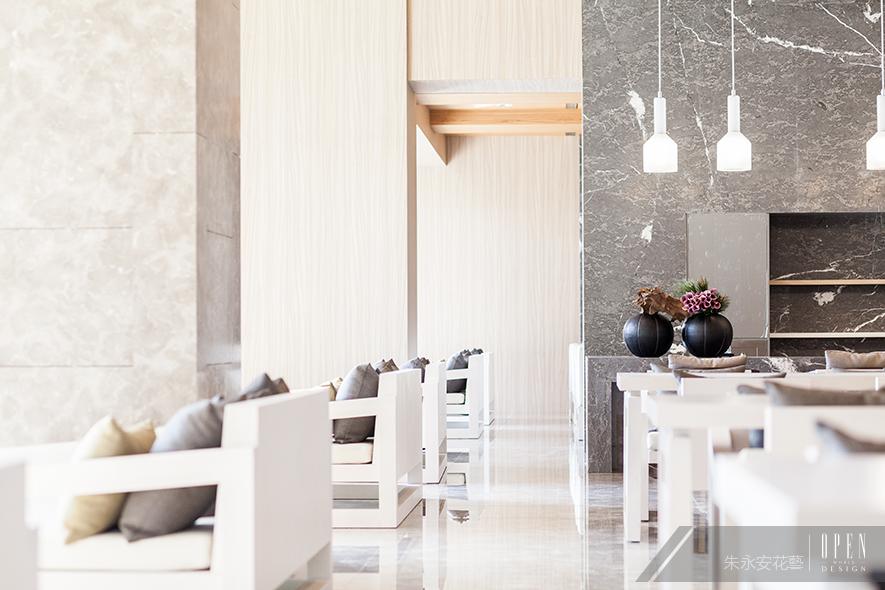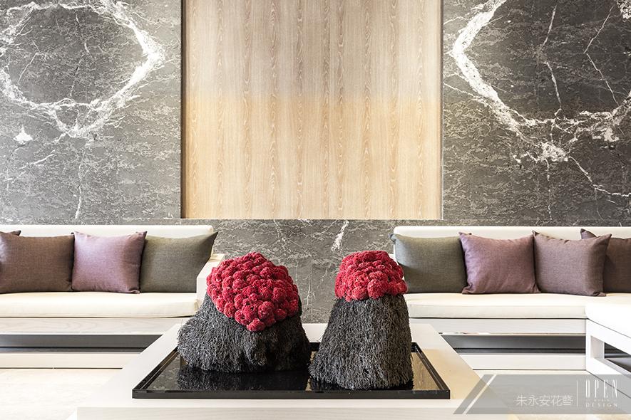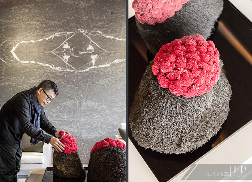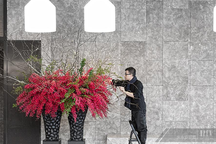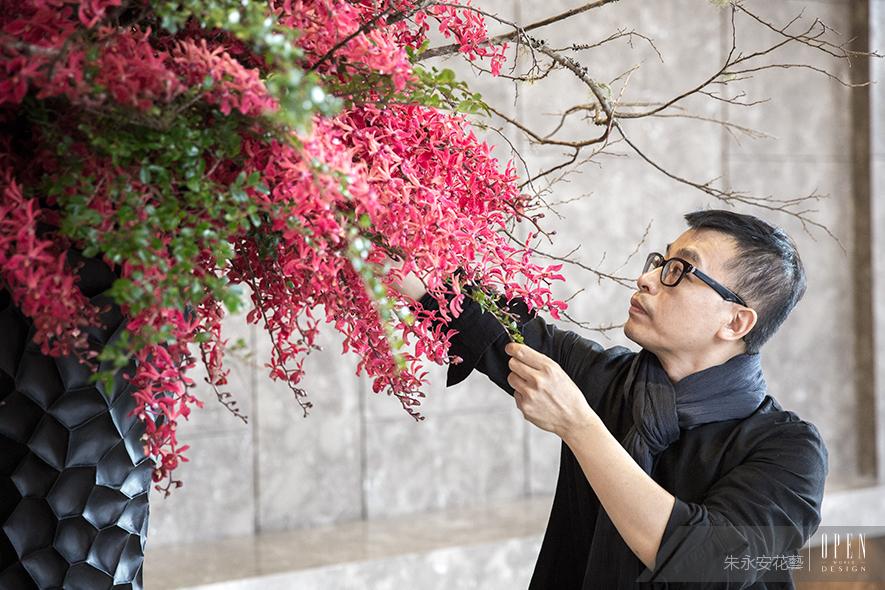 「仁人之心,以天地萬物為一體,欣合和暢,原無間隔。」抱持著讓花綻放生命力的心意,朱永安的細膩溫柔賦予了花卉形體顛覆的盎然生機。佇立於此的諾大花器,助長蘊含無限生機的花草、枝椏盛大綻放,替空間挹注磅礡而優雅的非凡氣息。