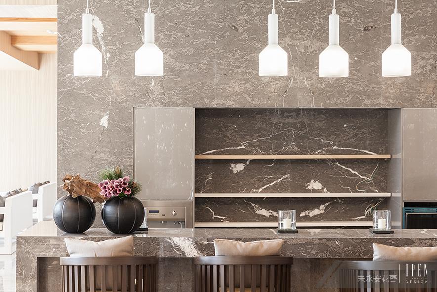 自然生命之美在於它的張揚隨性,而適宜的花器能替花卉疊加一分質感。吧台上,圓潤花器搭配沉穩色系,花卉素心坦然地輕落在花器上,形塑空間溫潤典雅的氣息。VASE FLOWER 朱永安 大師透過花卉譜寫情感及生命力,同時細膩品嚐盈滿空間的盎然生機,他的花藝精神深深觸及觀者的心。