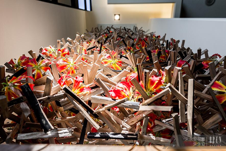 現代花藝同時具備裝置藝術的功能,由上而下的素材積累展現了「沈澱」的意象,希望每一年齡層的人能在看到此作時進行反思,探索身而為人的內在積累。作品中每一個斷木剖面皆呈現自然的肌理,牽引出人的一本初衷,檢視內心最深刻的角落。絕大多數現代人只能見到華麗的表象,卻不探究內在的沈澱,本作展演了一段尋回純真的歷程,細細品味,將會發現這便是「人」。《青天初綻》