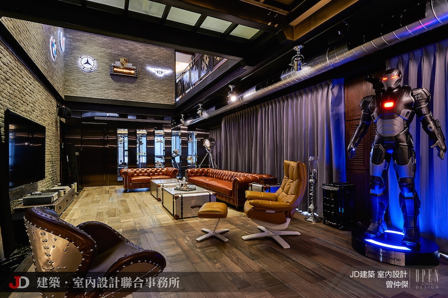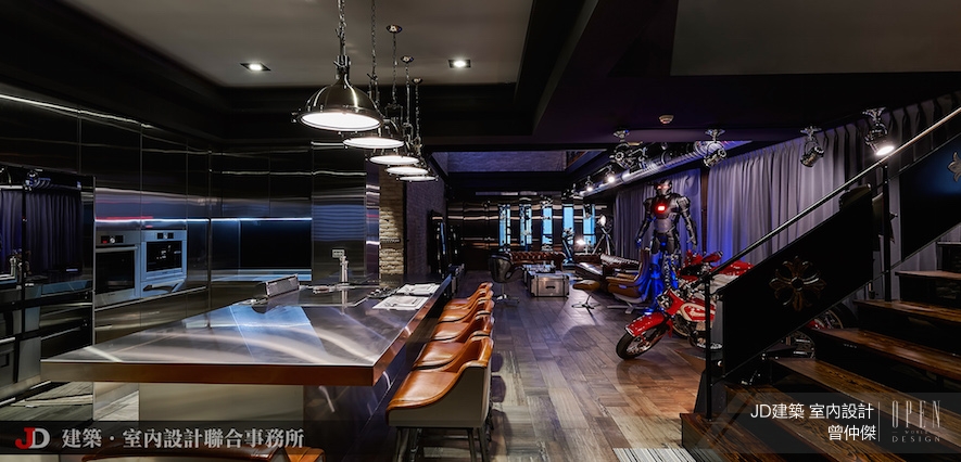 設計師利用管線搭接,在每個角落發揮實際和美感並存的巧思,舉凡利用水管搭接營造工業風的純粹感,皮革沙發和行李箱造型桌面也和整體達成完美共識,仿古義大利磁磚以大器姿態打造工業風獨有的美感,為業主性格做鋪陳,豪放不羈的靈魂中藏有生活高度品味。基於業主喜愛下廚並邀請朋友共享,設計師打造可以容納多人的鐵板燒空間,輕鬆自在又不失大器,讓業主可以烹煮嚴選的上等食材,品嚐佳餚、美酒,享受歡愉,交流日常瑣碎讓友誼昇華。