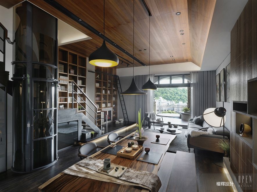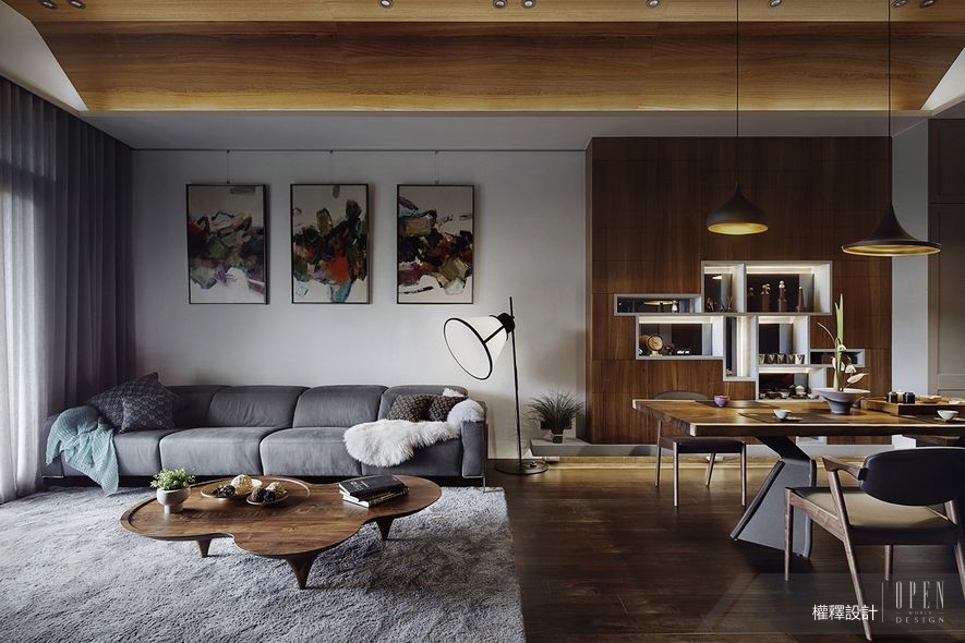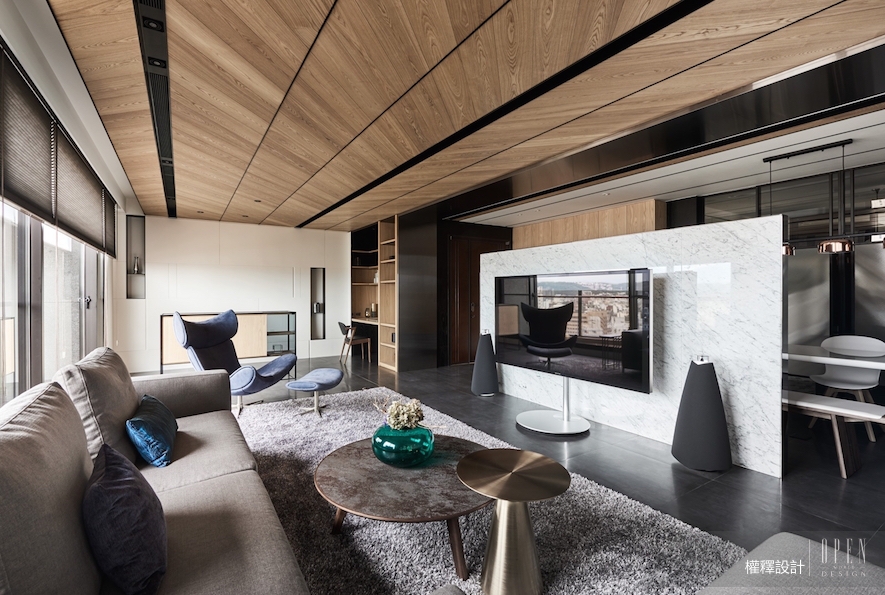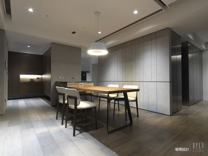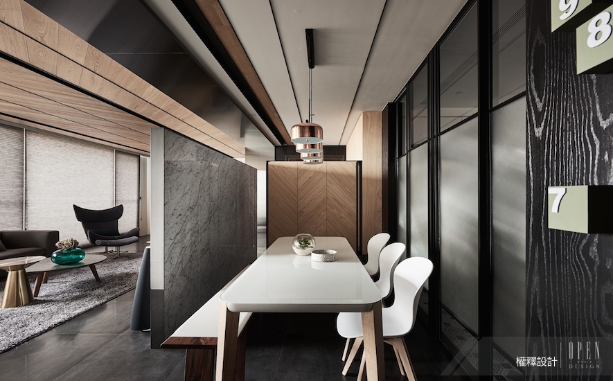 考量屋內的狹長格局,設計師以最能利用空間的一字型佈局安排場域,將凝聚家人的餐廳安排於動線中心,會客與休憩功能的客廳則安置於採光通風良好的落地窗旁;透過合理的動線設計,屋主一家對生活的想像被清楚勾勒,進而得到具體的實踐。挑高近四米的空間中,天花板延續入口處的深色木紋,平和內斂的語彙與場域中的寬敞大氣溫柔交疊,而滿室的書香則流瀉主人學識飽滿的雅士風采。在一派清新自然的設計風格中,我們讀出了抱樸守真的理想,是如何以溫潤靈巧的形象植入生活,並創造出悠遠而留有文人餘韻的藝術景觀。像是林語堂所說的:「最好的建築是這樣的,我們深處其中,卻不知道自然在那裡終了,藝術在那裡開始。」