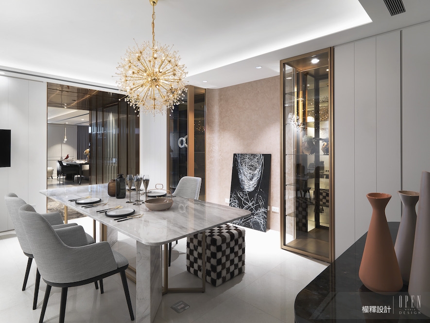 客廳窗外光線灑進,由蒙馬特灰仿古面大理石設計而成的電視櫃,順著光源漸進式的白至灰,有如中國山水畫般,給人淡雅而雋永的心靈昇華。切割面做出的特殊線條變化鑲嵌古銅鈦金線版,勾勒出簡單卻不失大氣的家庭氛圍,軟裝傢飾更恰到好處的點綴著,古典風格中不失現代感受,滿足了每一位家庭成員對家的需求與想像。俐落的設計手法、材質的靈活應用,使空間的層次感在推開大門之後慢慢加深;無論是一個人的閒暇時光、一群人的熱鬧聚會,這些無窮的韻味都被濃縮在國家首席龔公館中。