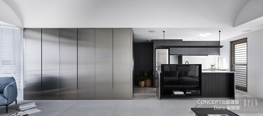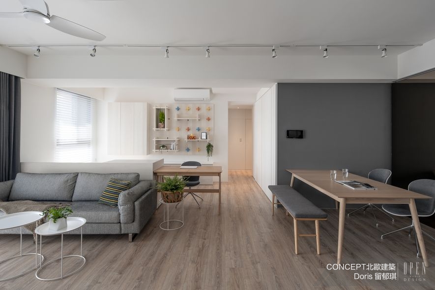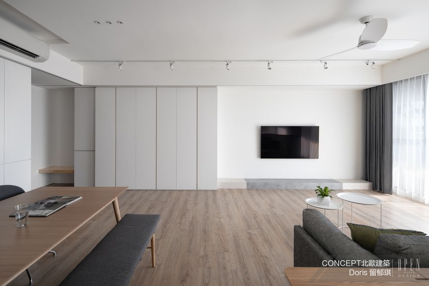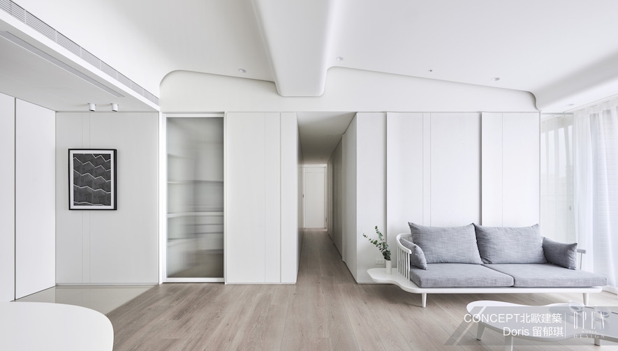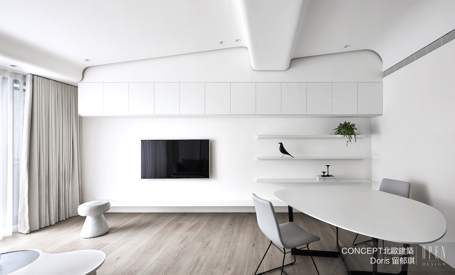 北歐建築的設計簡單而溫暖,採用大量白色與噴漆手法,使屋內風格清麗而素雅。弧狀的設計巧妙地將梁柱包覆,軟化直角帶來的剛硬線條,令視覺上充滿層次,也為空間帶進流動感。電視的黑對比牆面的白,和棕色系木頭地板相互呼應,在清透的色調中帶入沉穩與安逸。同樣素雅色的淺中灰沙發搭配開放式置物架和餐廳的設計,使生活不僅擁有便利性,無形中也放大了空間,自然地隔絕都市的歡騰與喧囂,在靜謐中擁抱白的簡單與樸實。