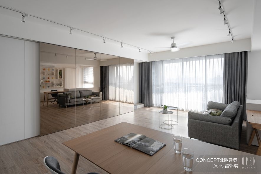 透過設計師擘劃出的簡單動線,一家三口的生活得在公領域自在流動;考量屋主收納的習性及對機能的要求,可移動的架高系統櫃應運而生;除美觀外,亦增加空間的使用彈性。特別設計的落地鏡牆面,映照出每一個晨曦日落的溫暖時刻,更讓女主人得在下班後擁有自在練舞的場域,重新拾回幼時的夢想,使生活隨處充盈著幸福的片段。