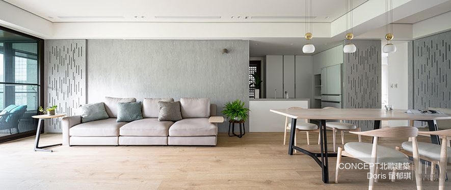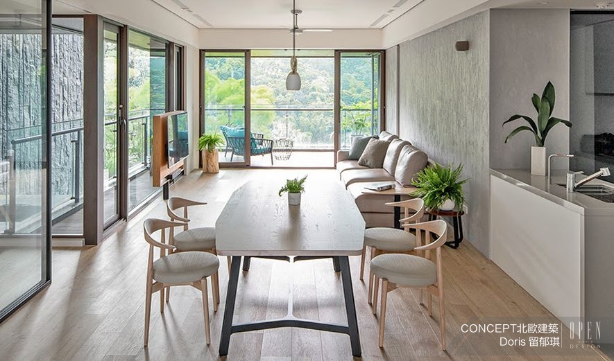 平日工作繁忙的屋主,期望歸家後能緩慢步調,放鬆身心靈品味生活每刻,並能就近照顧年邁父母,給予孩子歡樂成長的空間,北歐設計團隊在深入了解需求後,決定跳脫既定框架,於雙拼格局以「開門見山」手法勾繪玄關、客餐廚,屏棄隔間配置並放大公共場域,利用開放對稱設計使兩戶生活動線相繫串聯,拓展獨立與開放並具的舒適空間。透過大量留白手法,質樸素材烘托豐沛日光及翠綠林景,自然天光亦融為居家中一道風景,逐漸構築起三代家庭貼近互動的舒活質感宅。