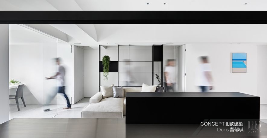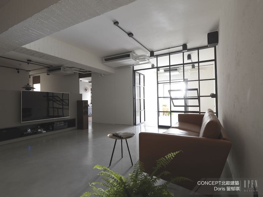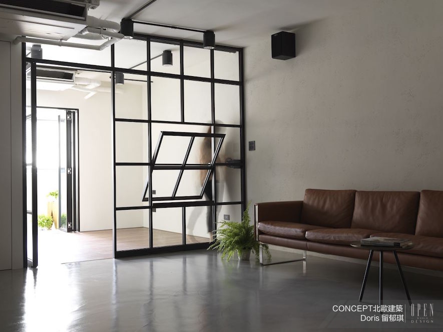 從玄關踏入客廳,立刻被大片的玻璃窗框所吸引;設計師拆除原先遮蔽光線的間隔牆,將靠近玄關處的一隅作為彈性空間。利用黑色鐵件線條將場域進行劃分,透明的玻璃窗為室內引進更多採光;特殊的機械式旋轉窗,創造良好的通風與透光環境。彈性的起居空間採木質地板,與客廳的水泥灰地面形成冷暖色系的對比,亦同時將「工業風」與「北歐風」兩種風格融匯於此。