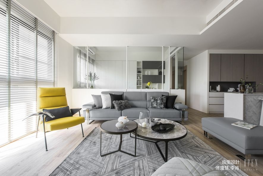 循光走近起居空間,與餐區通透相連的無隔間規劃,招呼落地窗光排闥入室,映亮由玄關起始疏密設置的主牆飾板,仔細觀察令其低調現身的光影變化,有如輕敘無形的聲波震盪著情感聲量,不意中激起團聚此處的內心共鳴。而橫亙低處的黑影,則是鑲嵌於牆的置物平台,提供擺放展品及收納機能;水平望去,與之齊高的濃灰沙發將起居敘事舒展開來,同色的地毯紋理與圓筒椅凳對應,襯托一側明亮的蜂黃色單椅,平舉起七巧板般的造型扶手,俏皮中悄然平衡場域溫度,形成融洽而舒適的生活意象。