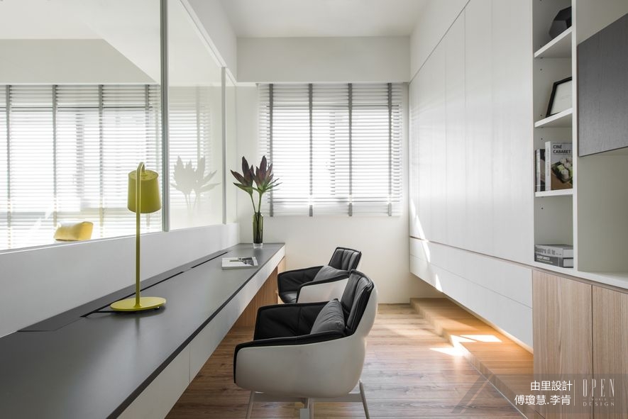 至於起居區後方的書房,是由「純白」與「透亮」構成的獨立空間,白意延伸為齊頂壁櫃及開放式層架,有效利用空間的狹長走勢卻未增半分窄仄,搭配三面裝設的清玻璃,大大提升區塊內外的連動感,使個人閱讀沉思的場域不再閉鎖。而延續外界的色彩語彙,選用墨黑作為書桌檯面,一方面將空間重心調配在此處的核心區塊,滿足日常閱讀作業的需求,同時達到耐髒汙且易清潔的實際效果;而承托著視覺重量的白色抽屜與之一體成型,並巧妙對照閱讀椅配色,點上一盞開朗的暖黃桌燈,塑造令人會心一笑的討喜氛圍。