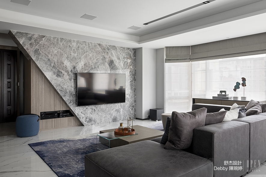 陽光透過柔紗窗簾緩緩瀉下,一片沈靜灰白,搭佐藍黑軟件,濃淡有致氣蘊柔散。目光落在優雅的電視石牆上,設計師以切割的線條劃開,相連溫潤的木質立面,為尋常的生活場域注入視覺亮點。沈浸其中,發現原來生活可以如此慵懶而兼具優雅,不需過多地舖張堆疊,不需鮮豔奪目的色彩;重要的是保有休憩的本質,卻同時綻放不言自明的高雅矜貴。