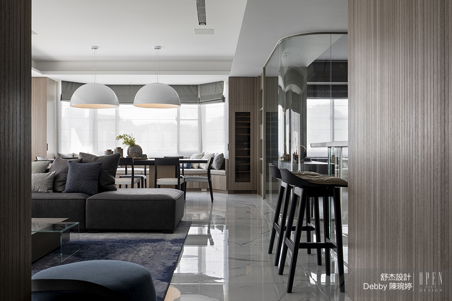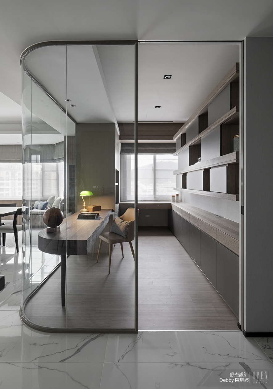 公領域及私領域的過度區,設計師運用柔和線條與自然元素,無形地帶動場域動線的連接。餐區、臥榻、書房間,可見木質的律動,深淺對比增添區域間的層次感,更平衡了冰冷地坪的溫度。而清透的玻璃隔間,使屋主保有獨立隱私之餘,亦能享有寧靜開闊的視野,守望著家人的溫馨時刻。
