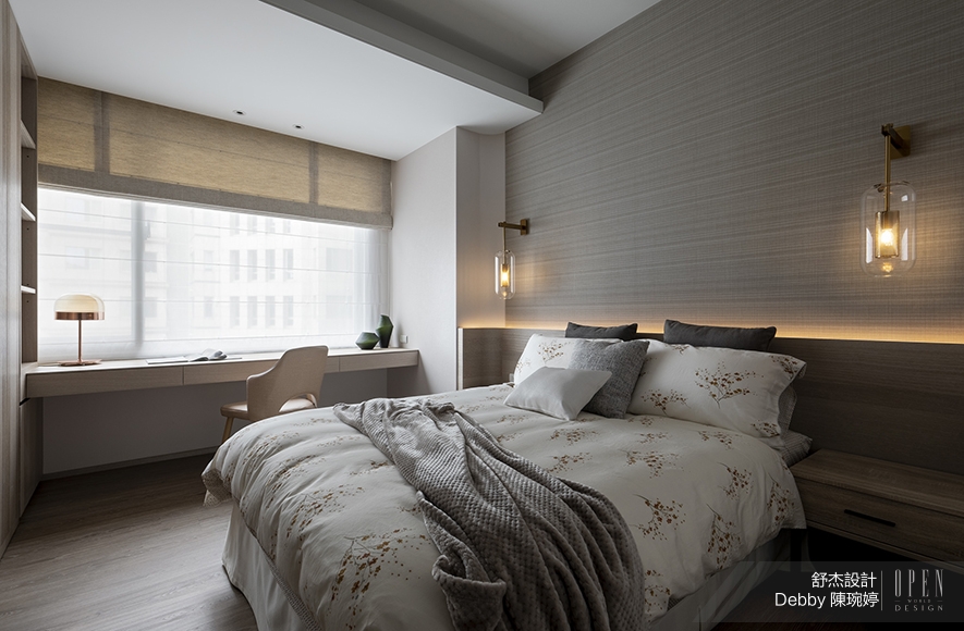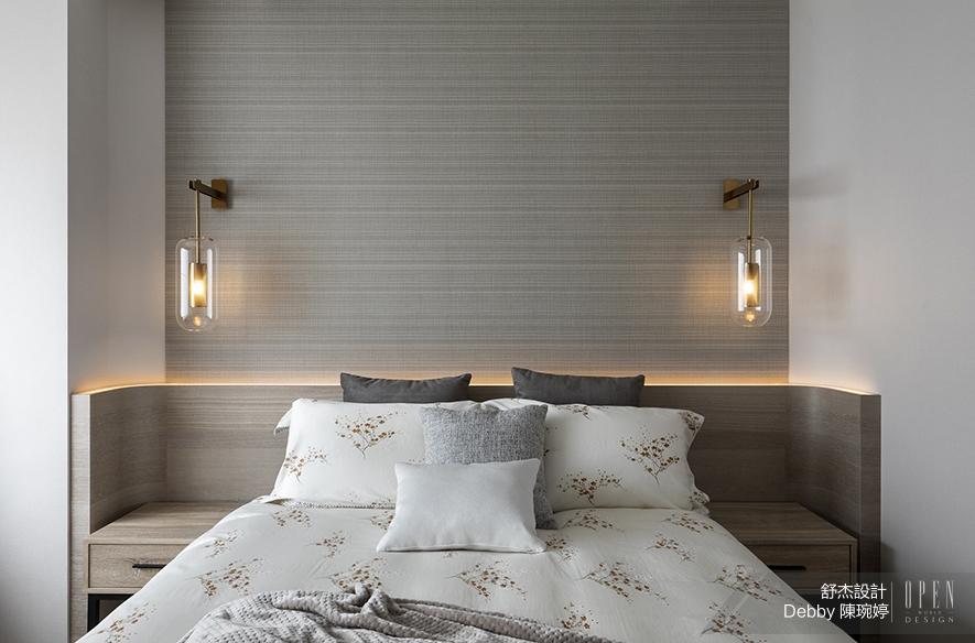 腳步來到私領域,主臥室採用素雅的米白色調呈現,搭配柔和燈光,盡顯柔暖典雅。在卸下一天的疲憊後,臥室成了舒放身心的所在;而這裡,設計師同樣不採用過多的裝飾點綴,僅保有基本的實用機能和通透光線,讓屋主能全然放空的享有舒眠空間。