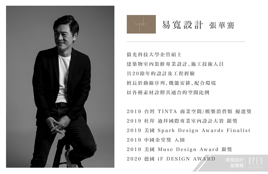 本著傳承的心願,易寬設計 張華騫 設計總監 肩負起「大哥」的責任,希望將公司的品牌建立起來隨之拓展,提攜更多後輩,讓他們擁有發光的舞台,一如 「易寬」的初衷——廣闊無垠、沒有界線。在張總監身上,我們看見醇厚的靈魂裡,一顆真摯廣博的心;不張揚、不賣弄,以不卑不亢的姿態,引領團隊向前邁進,寫下下一個20年的序曲!