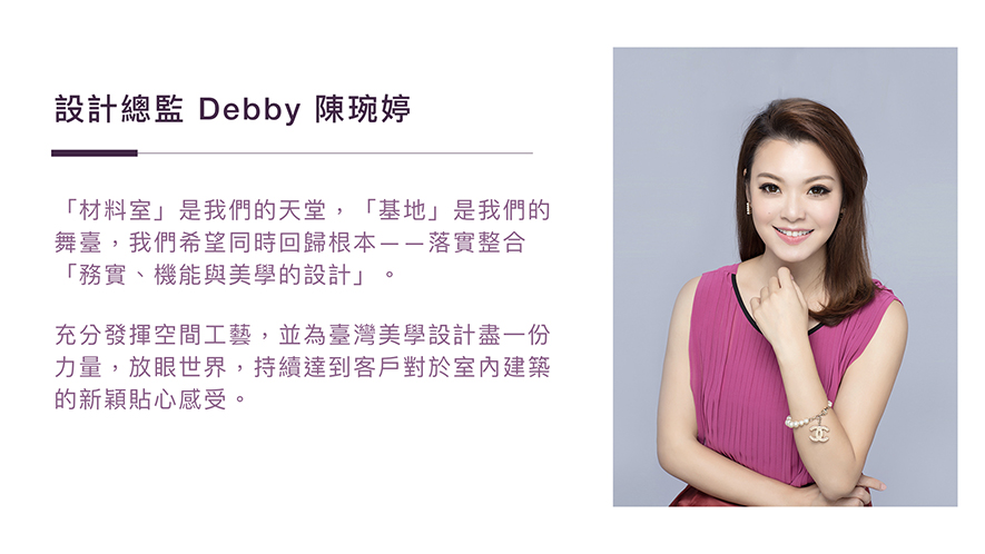 旅居國外的豐富學經歷背景,啟發浪漫感性的Debby總監,讓她得以多面向地站在業主的角度思考,將每個個案以優雅、舒適的質感風格予以呈現,其獨特的氣質與品味,獲得時尚聖經「Vogue Taiwan」和引領高品味生活的「Mansion豪邸」聯合報導,將唯美的設計女力綻現眾人眼前!