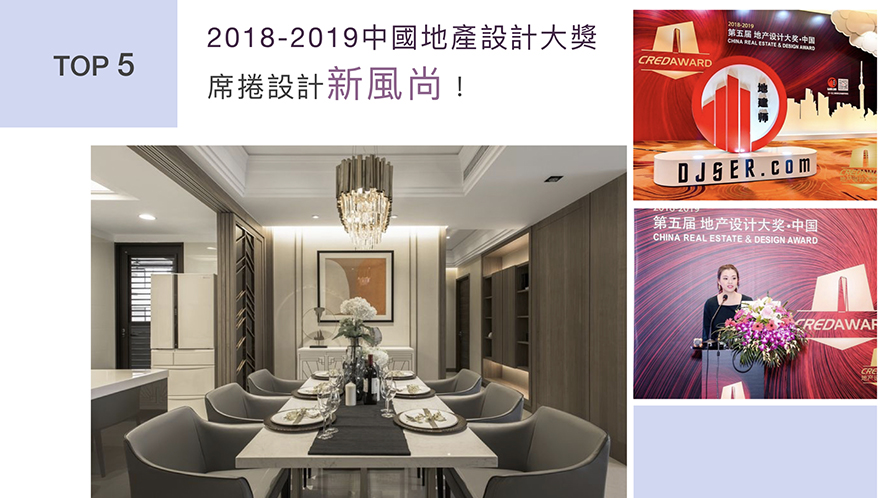 歷時五年,「地產設計大獎」已然成長為中國極具影響力及號召力的設計大獎,擁有設計高質量並力求突破的Debby總監,憑藉作品《金迷風尚》中絕佳的藝術層次美感及細膩質感,形塑出華麗貴氣與優雅兼具的風尚品味,大大地征服評審胃口,進而順利前行最終決選舞台,我們也拭目以待後續更加令人驚豔的設計出演!