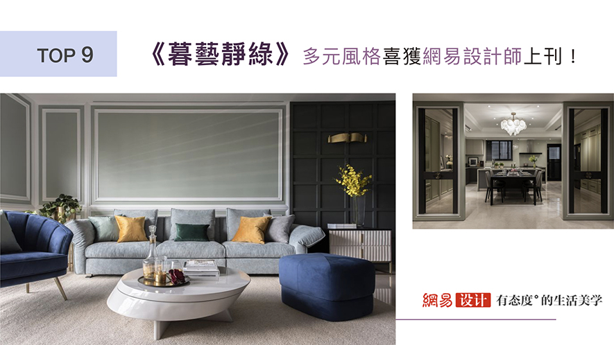 每一次創作都是對過去的省思,飽覽歷來設計大師手筆的Debby總監,將前人積累的美感經驗轉化爲自我領悟,本次藉由住宅空間《暮藝靜綠》,施展出融匯多種設計取徑的個性風貌,除了一如既往地良好發揮圓弧的柔和特質,亦展現對剛毅線條的特別心得,風光登上《網易設計師》平台。