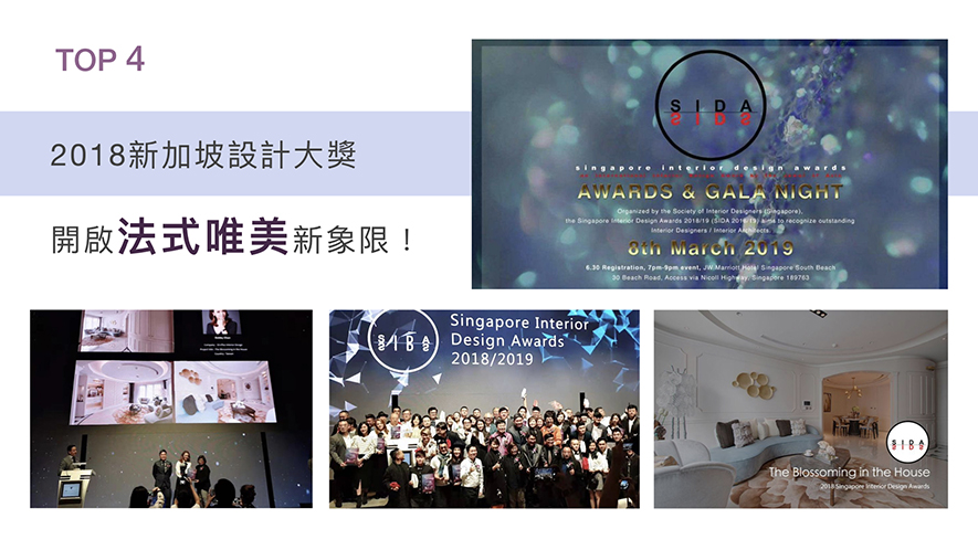 由新加坡室內設計協會積極舉辦的新加坡室內設計大賽(SIDA),立基於推廣國內及亞洲地區設計力量,以亞太區域新興賽事之姿,持續號召並推送秀異設計者登上國際舞台。透過弧形意象敞開空間感受,進而與建築量體外觀的流線造型呼應,達至「Outside in, inside out.」的合度搭配,Debby總監以作品《迷漾巴黎》從容取下「榮譽提名獎」,為現代法式的生活體驗,添上令人欣喜的美感指標!