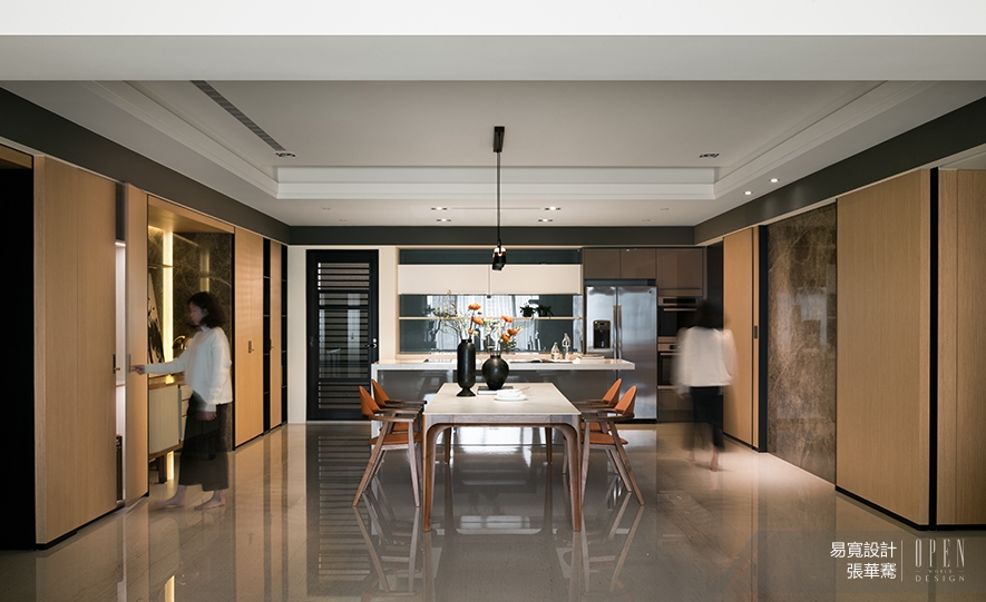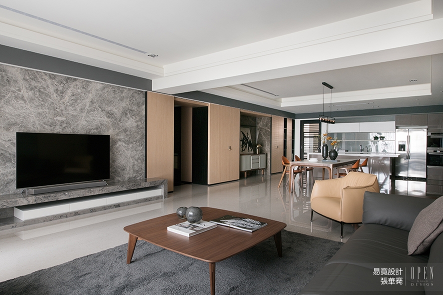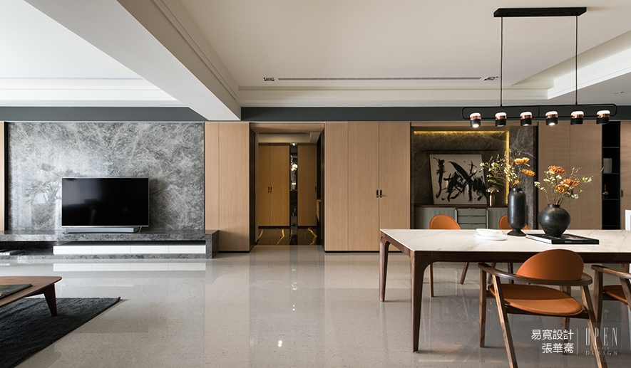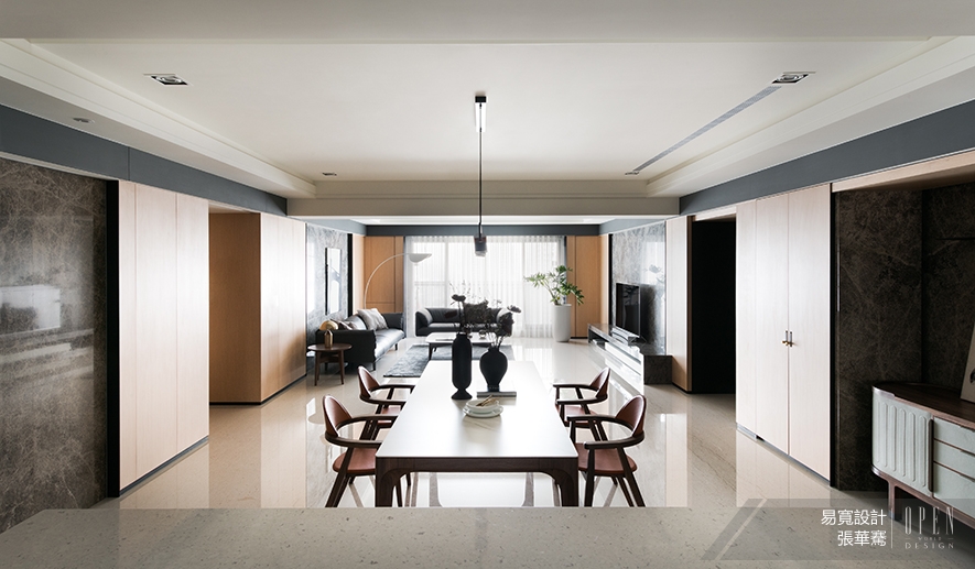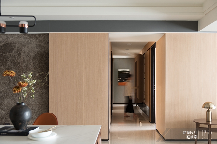 由玄關引入,緊接著是視野橫向寬廣的公領域,以淺色基調為主軸,四面石材主牆串連客、餐廳,賦予空間平衡感;抬頭上望,天花板的金屬烤漆立板圍塑場域整體,增加視覺景深效果,大量自然光的引入,為平面帶來寬闊舒適的視野。