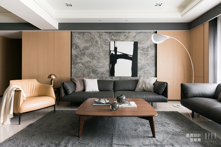 淺色石材直面彼此,花紋斑駁相互映照,彷彿濃淡水墨以客廳為宣紙,浸染出迷人的墨色。柑橘色單人沙發與其後的木材牆面,在灰黑底色的客廳添上一筆豔麗,整體色調配置淡妝亮相,卻仍給人嫻雅綽約之感。