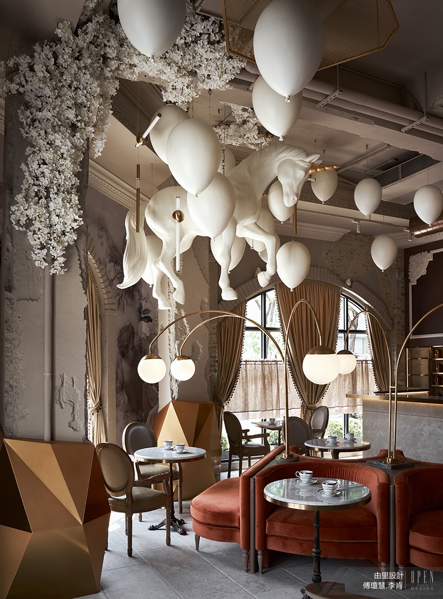 The setting turns the clock back to Medieval French. The sense of history fills every corner of the space. The preserved portion of the original building and the traces of formwork left intentionally on the ceiling and columns create a patina effect. Similar elements are the molding on the wall, pipelines and appliances, the brick masonry door frame, the chandelier and embedded lights, guardian-angel mural, plastic balloon, and the unicorn. They meet mid-air four meters above the floor, giving forth a disorienting vastness with its dynamism of descending order.