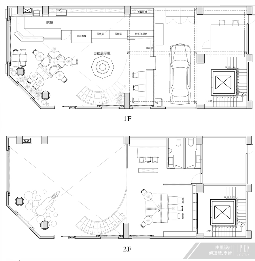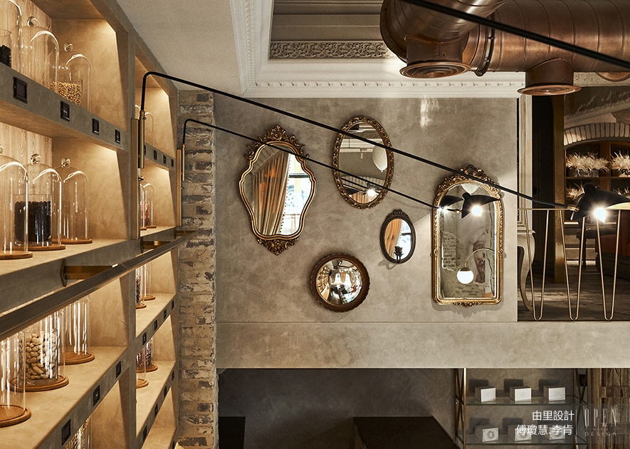 拉了古典線條的長軸檯面,與整面裝置製作洋菓子原料元素的玻璃瓶櫃置頂,定義自由往返現代與古典的跨時空尺度,呈現精緻與原料粗獷之間質量對比的衝突。