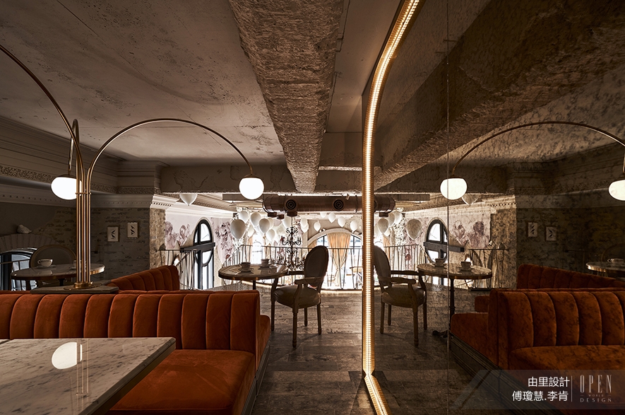 場景設定為法國中世紀,帶有歷史感的設計手法,適度運用於空間各處:例如:部分保留建築物原狀,天花板與柱體拆模時特意留下痕跡,並作舊處理;線板與牆桓,管線與電器,磚塊撲疊的門框,水晶燈與崁燈,天使壁畫,塑料氣球,獨角獸,皆大肆裸露,在看似廣闊失序的挑高四米空中交會,沉降的層次幡然,充滿動態感。