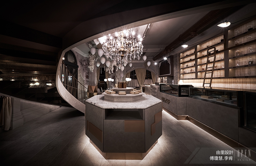 在現實的場域,由里設計 傅瓊慧 設計總監、李肯 主持設計師 築了一個夢幻境地,走進去,甜點如魔法輕施,在人的味蕾上跳動、翻攪,瞬間曳引出舌尖上的歡愉。將甜點予人身心抽象的“幸福感”,具象化為空間設計時,味覺移渡至全感官的體驗,當人們身置如糖如蜜的包覆裡,大作夢境的美妙時刻即將開始。