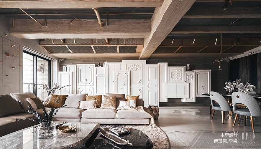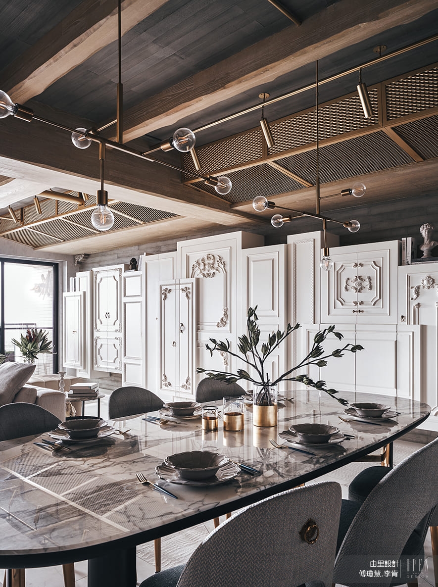 4. The ceiling is exposed with extra clearance. The main lintel suggests the division between living and dining areas. The other asymmetrical fake beams and meshes integrate the wiring and light fixture, galvanized with gold. The beams with varying widths on the ceiling are asymmetrical in contrast with the asymmetrical lines with mixed lines on the floor. The formal structure disintegrates, only to be pieced together again. The functionality and aesthetics complement each other.