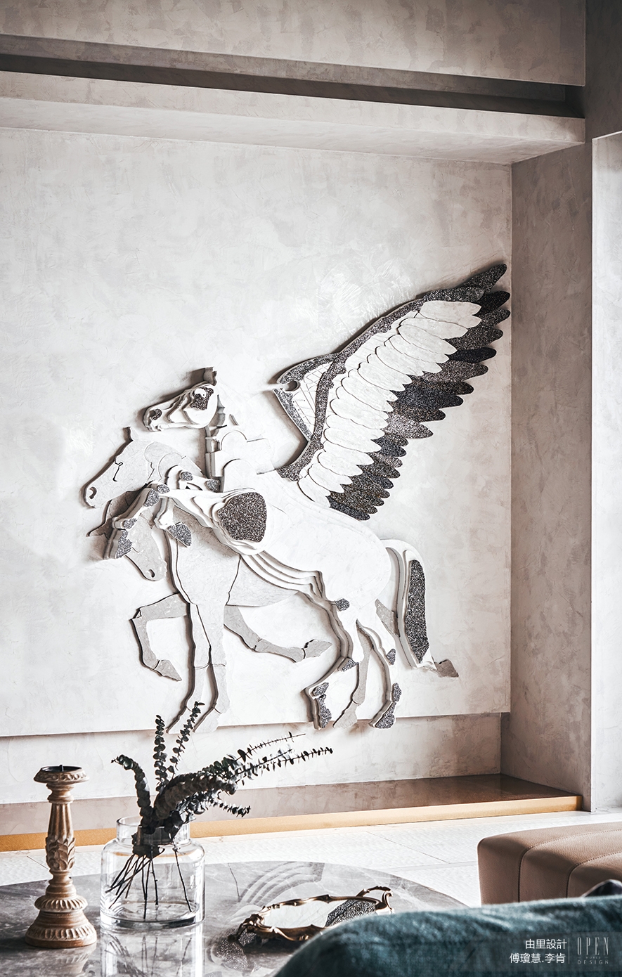 3.客廳以雙向沙發搭配不規則桌面為軸,朝向電視主牆的面,以對稱顛倒的飛天馬展開,如皮影戲般片片疊成的飛馬造型,局部鑲嵌水晶鑽,如裝飾藝術的景致,動態奔馳於居室。
