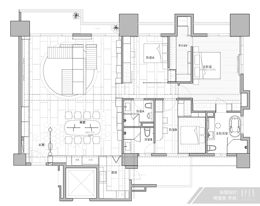 業主作創意相關工作,想擁有獨特個性的家,歡愉與聚的時光居多,因而公共空間佔比大並分四個區塊,以平衡區域功能且各具景致:
