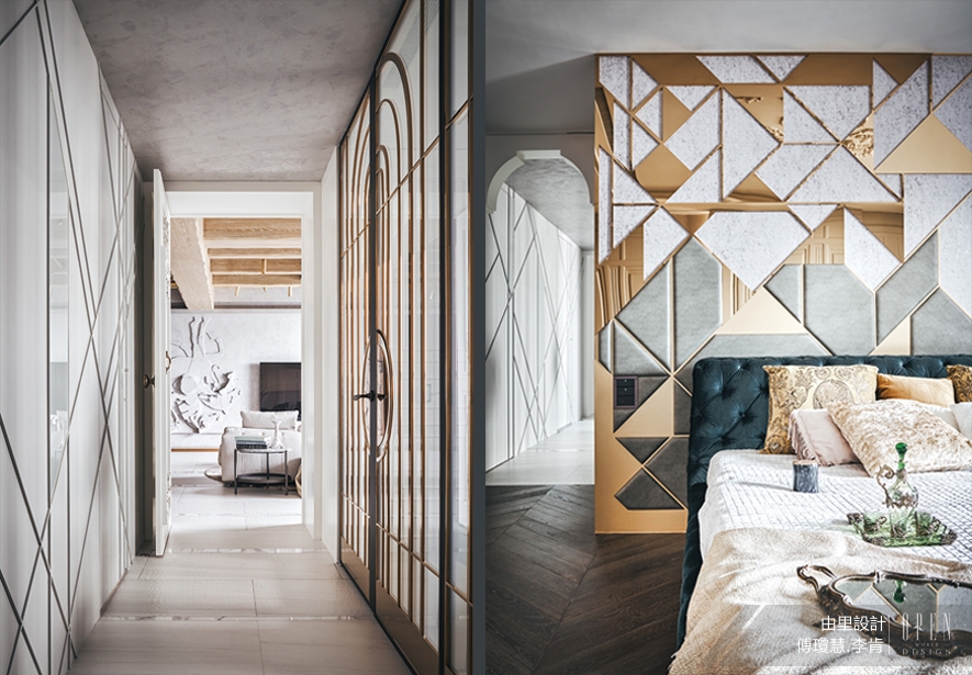 6.通往臥室的通道兩側,一邊是以Art Deco線條設計的圓弧鍍鈦反射線板,內崁通電玻璃使玻璃霧化,走道另一側是菱紋線條,通道圓弧鍍鈦透明玻璃門與對牆幾何線條封板暗門的對比,夾道是疊影綽綽的風華。臥房背牆延續通道幾何古典線條,金色鍍鈦鏡面,繃皮革,藝術塗料,異材質的契合,演繹密綴,疊襯而有序的美學手法。