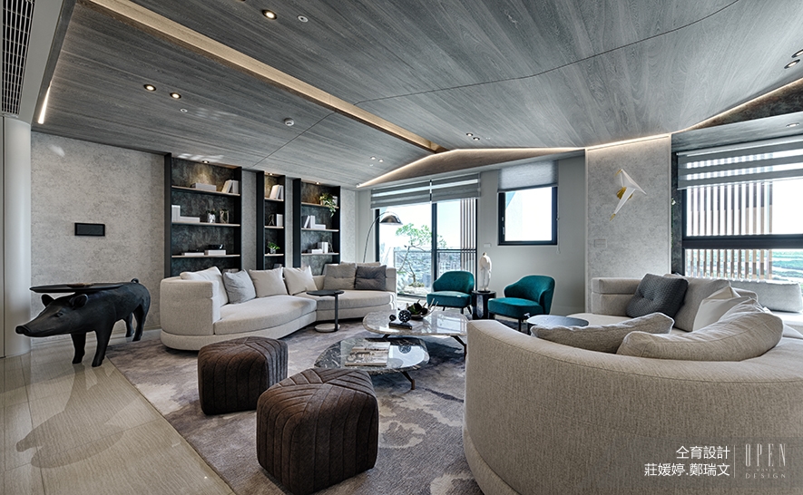 (圖)空間面最廣的天花板,在客廳呈現山陵的感覺,轉入餐廳則換為柔和的流水意象,運用「太極」概念提升空間的協調度。
