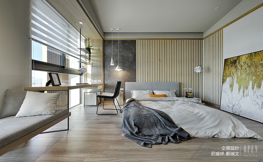 不同於主臥室現代精緻的風格,次臥室重回樸實自然的懷抱,整體使用較為單純的木色為主要基調。無床架的床鋪設計與窗邊的臥榻,以自由多元的休憩選擇放慢時間腳步,將慵懶柔軟的溢滿空間中的每個角落,而書桌前的百葉窗,則豐富了自然光影流瀉的角度,將其佐茶與書,呈現歲月靜好的療癒氛圍。