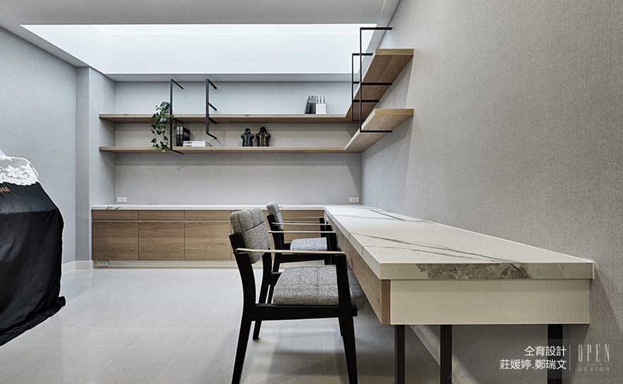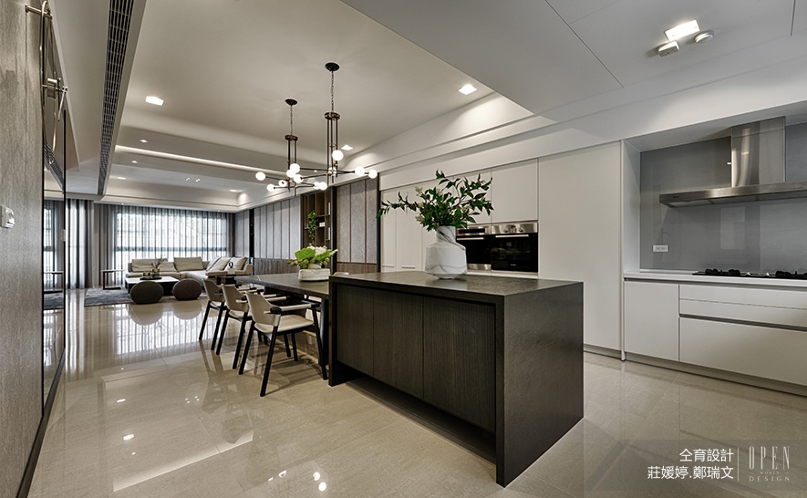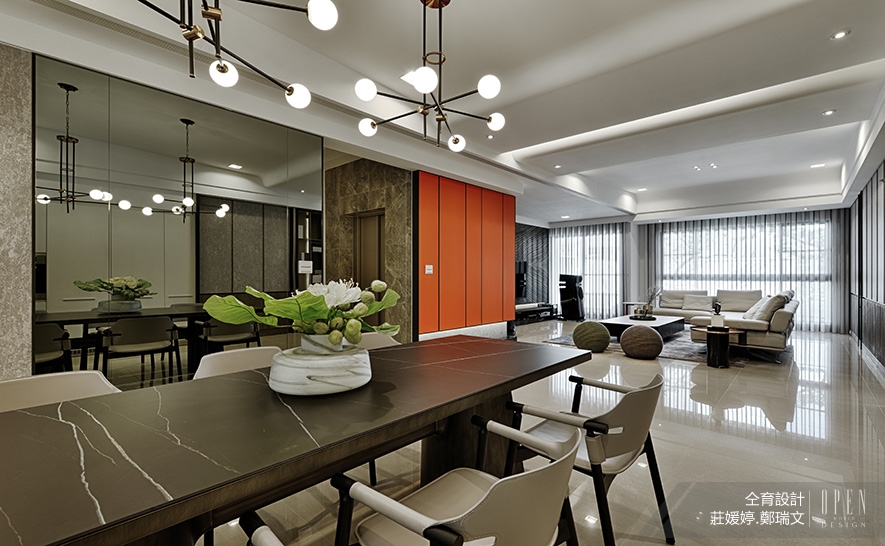 開放式的餐廚區,除了延續公領域色系,使場域視感舒適流暢,於動線規劃上,連接一體的烹飪台與工作台,讓家人與賓客皆能保持互動。餐桌以白紋黑底石板搭配實木打造,串連空間的冷暖平衡感受,而在幾何球狀燈飾引領下,亮光下的餐桌景色,反射於透亮的灰鏡中,映照家人歡快的時刻。