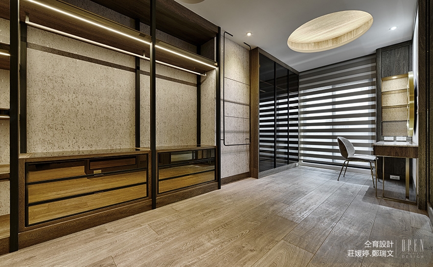 延續私領域的線性格調,空間在立面與窗簾的縱橫交錯紋路下,塑造俐落的視覺感受,不規則的天花,更增添變化多元的氛圍。光源燈具搭配上,不論是化妝檯旁的金屬掛燈,抑或床頭旁的造型聚焦燈,皆和緩場域,並在當中挹注沉實氣息,讓居者踏入其中,便能體會自在恬逸。