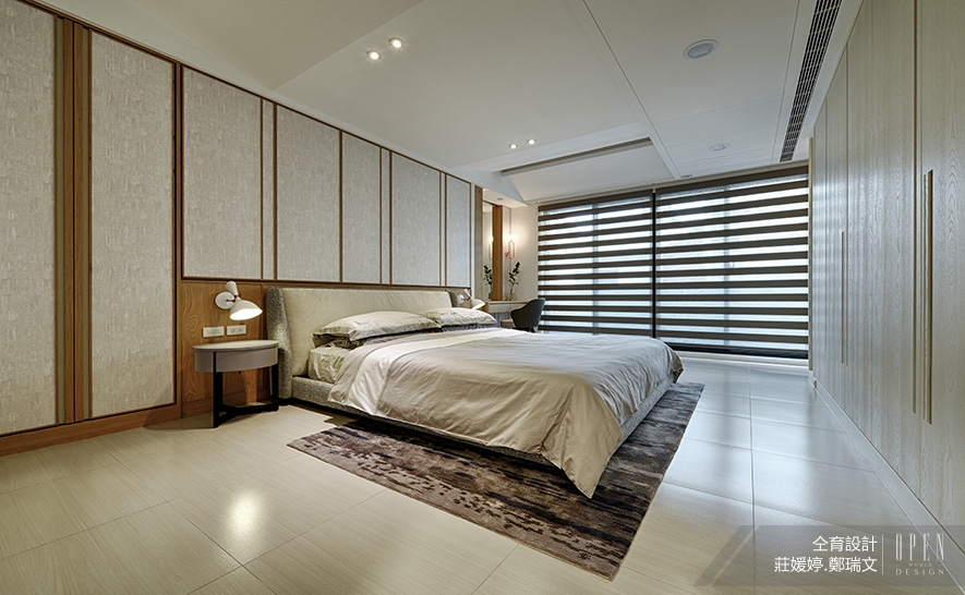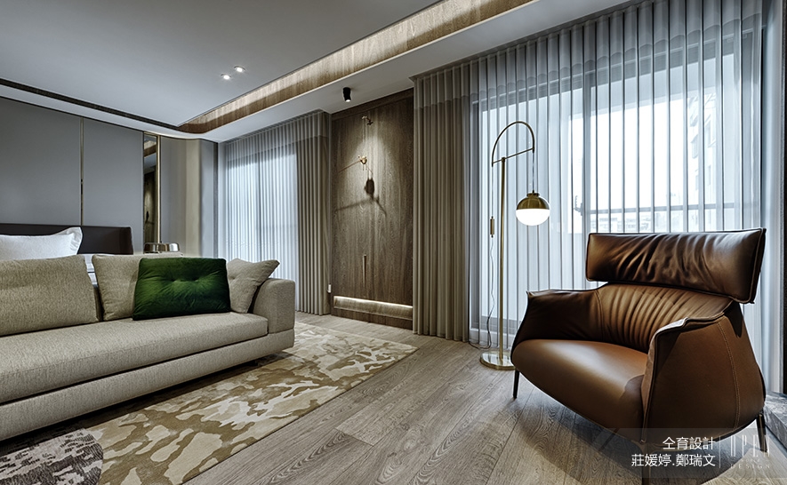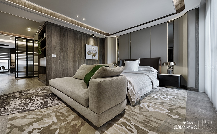 偌大的私領域,串連臥床、書房及更衣室,整體色調以灰白為基底,並點綴香檳金屬色,織成一片和諧畫面。木紋立面藉圓弧轉折,連結銀灰床頭板,使得空間充滿圓潤的質感,臥床另一側,則有微光透入的直條窗簾及實木的電視牆,藉由異材質的共構相依,豐富場景生命力。