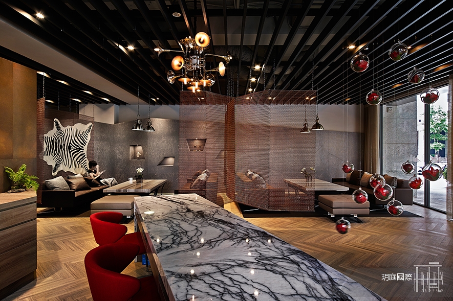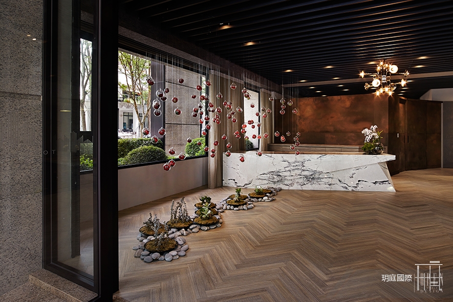 中央懸吊的亮眼金屬主燈,向四面八方伸展,深深吸引過往路人的目光;循著窗戶旁,引渡自然氣息的裝置藝術,走過精巧綠植與浪漫的玫瑰球型掛飾,便見紋理華美的大理石櫃檯,搭配鮮豔的紅色單椅,熱情大方地迎接賓客到來。