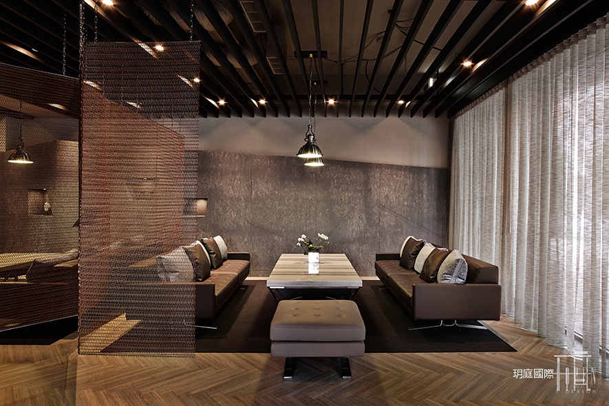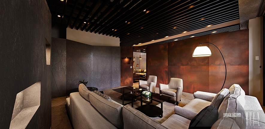 貼合豪宅建案的高端形象,沉穩的灰階基底中,上下對應的鋁格柵與人字拼地坪,鋪展豐富的線條層次,而粗獷的鏽蝕鐵皮牆,恰好與精緻大理石櫃檯、玫瑰金屬網簾形成鮮明對比;每個細節角落,皆散發獨一無二的美感個性,於此強烈碰撞、產生視覺火花,最終和諧交織為一室優雅藝景。