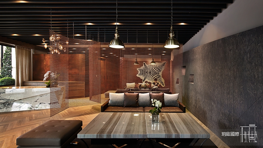 細膩的玫瑰金屬網,輕盈圍塑無拘氛圍,其面對的曲折石紋灰牆,則散發厚實穩重,讓人於此安心交談,或靜賞牆面展示的珠寶與名錶;其中低調灰階的桌椅與窗簾,各自呈現皮革、布料及大理石等豐富的紋理表情,一路和諧鋪排至場域盡頭,由一張精緻柔軟的斑馬紋皮草打破平衡,充滿張力地為視覺收尾,予人深刻印象。
