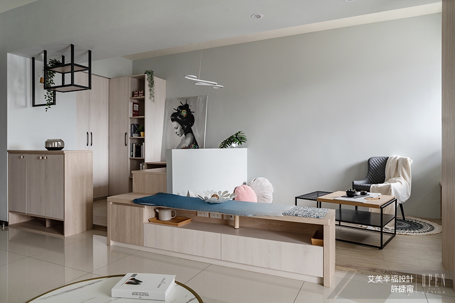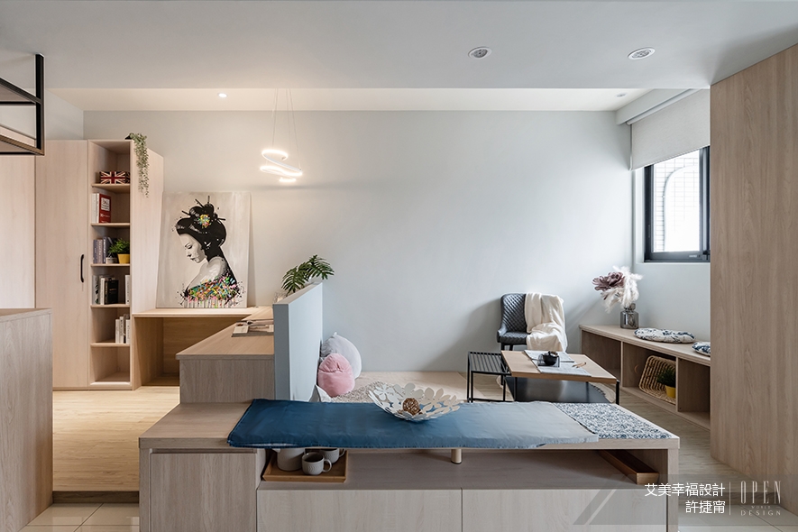 由於希望各區位的劃分無隔間,於是從地板做主要設計區分——架高地坪處設為工作及睡臥區,其餘場所則做公領域利用。地面以外,櫃體的擺設也經過精心規劃,使各區位相依相生。在此之上,整體更以淺色、日式及禪風調性開展,搭配低矮家具,渲染全室的簡約恬淡氛圍。