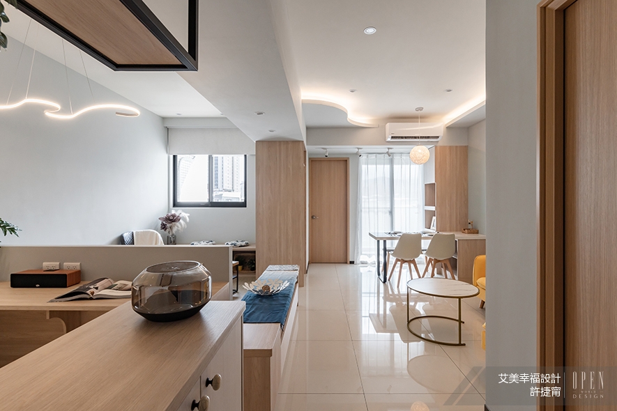 The amusing antler molding light at the entrance, the curvy chandelier with Tai Chi image in the working area, and the Japanese rattan circular lamp in the living-dining field possess striking features of each one. Furthermore, set up a laminate panel of arc-shaped pattern with indirect lighting, which not only conceals the electrical circuit but also matches the soft lighting in the working area. Besides, expand the function of the beam and column while giving a gentle finishing touch.