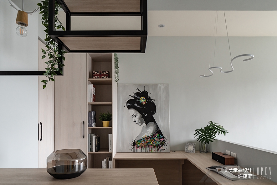鞋櫃上方,中空的鐵件木質架形塑穿透感,垂墜綠色植栽,展現濃濃和風;鹿角吊燈帶巧思俏皮,黑鐵與木質的結合,承載複合材質的趣味。完善收納功效之時,秉持最大化空間、使視域一目瞭然的情況下,延展至牆面的書桌,銜接開放式書櫃,以及衣物的封閉收納,滿足機能要求、豐富視覺變化。書桌與睡臥區之間,輕鋼架做底的隔間,以溫柔沉靜的灰藍色系包藏各式線路,其厚度留有日後加裝框架的空間,也使睡臥區具備安心倚靠的部分。