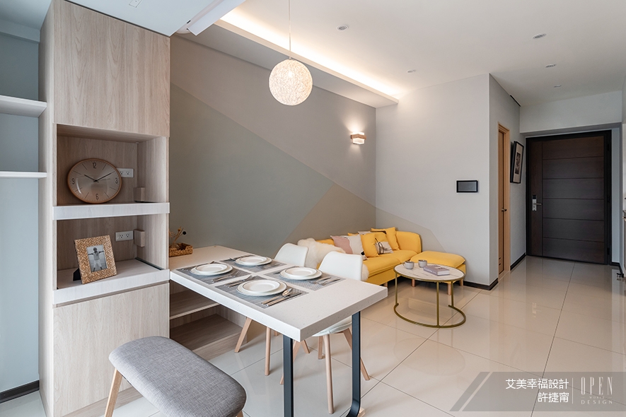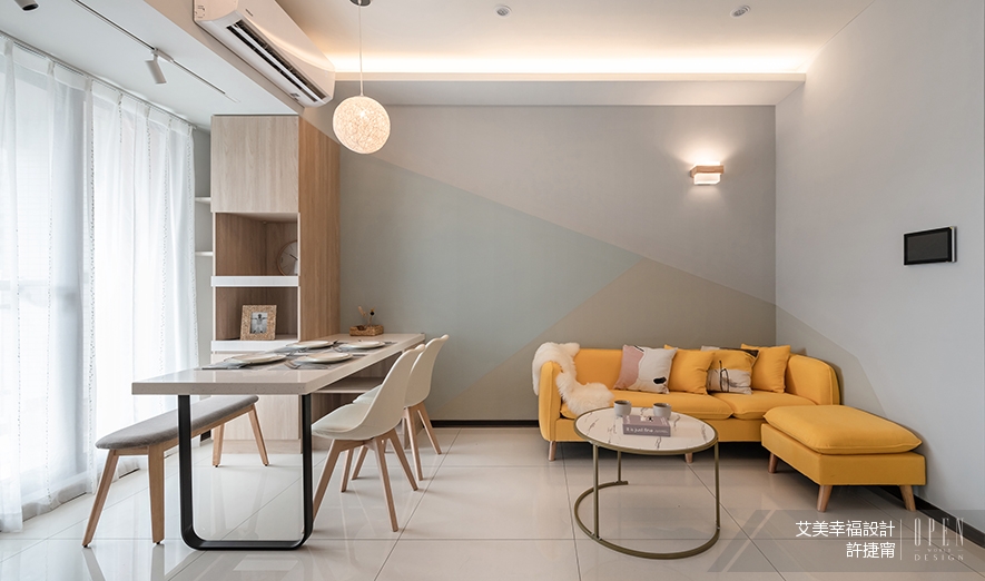 客餐區天花板,設有夾層燈源隱藏廁所風管,其下背牆使用繽紛舒心的日曬、灰綠色跳色,闡釋北歐簡約風範,展露慢活步伐,寄寓步步高升心願的圖樣,並在其中點綴一盞壁燈,讓牆面沒有過多留白;目光落於鮮黃色沙發,活潑明亮的軟裝配置展演生活充滿活力的一面,搭配前方古銅金金屬腳、石紋面板質茶几,顯出多元化的選材氣質。