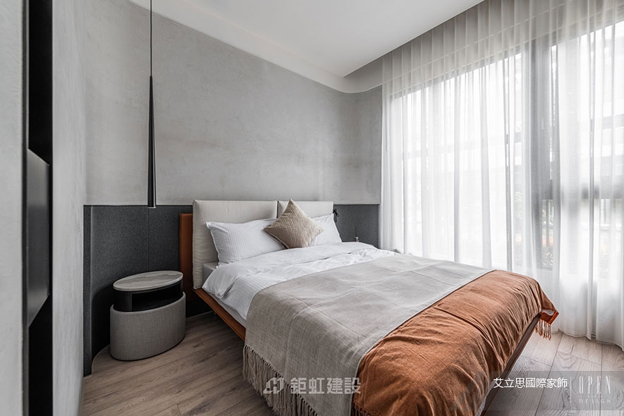(圖)艾立思團隊在色彩明媚的臥室中,以棉麻材質的床鋪,搭配造型纖細的吊燈及單椅,帶給樣品屋參觀者輕盈舒適的視覺體驗。加分妝點 完美空間細節
