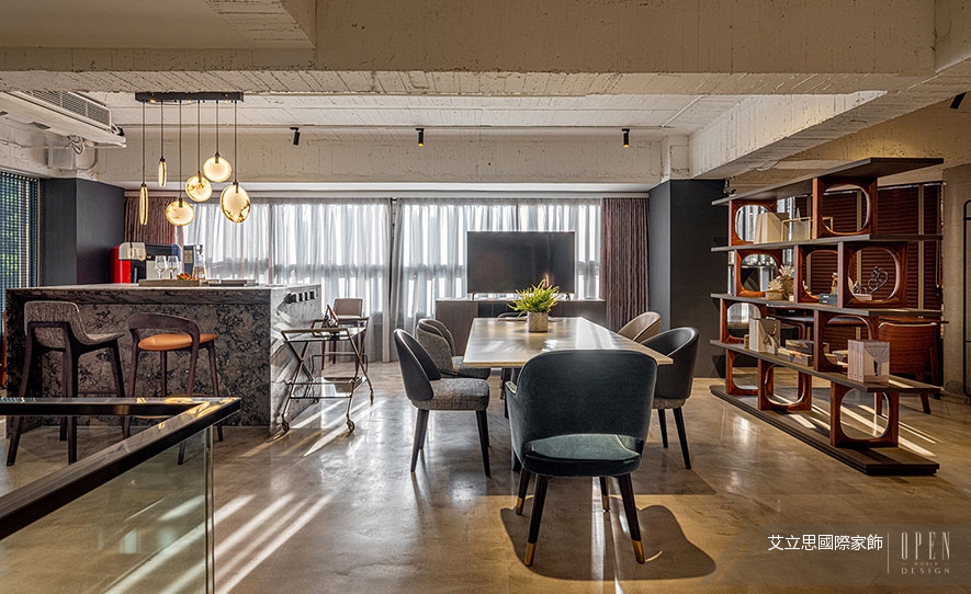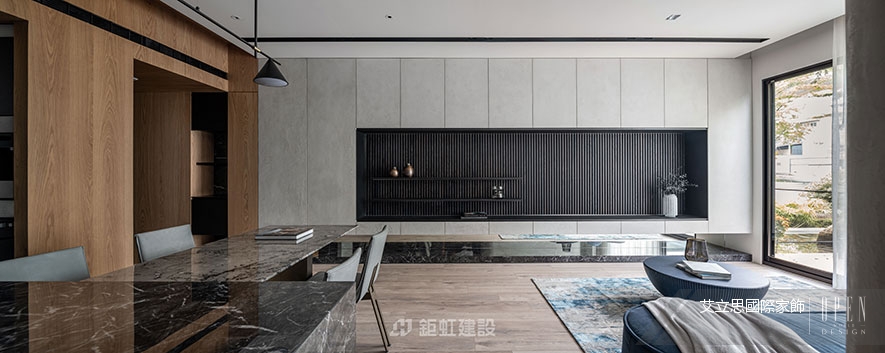 (圖)艾立思團隊於《鉅虹建設 森Casa樣品屋》一案中,配合空間深色的木、石基底,選用低飽和色彩的軟裝,提煉出活潑的生活氣息。精細分工 追求專業效率