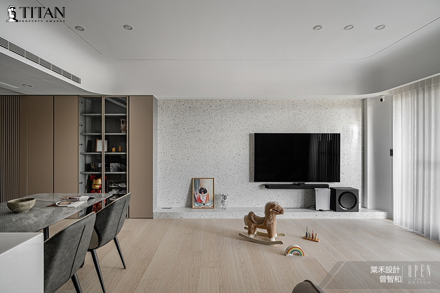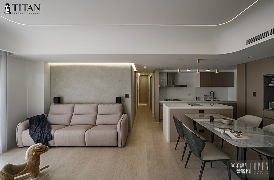 棠禾設計 曾智和 設計總監 於公領域天壁及多處轉角匯入曲弧元素,攜手立面洗鍊的線條造型,呈遞優雅而俐落的時髦風韻,其間選配暖色調和木紋的家具、櫃體,成就溫潤和暖的家宅作品《潤晴》,榮獲2024 TITAN Property Awards銀獎佳績!