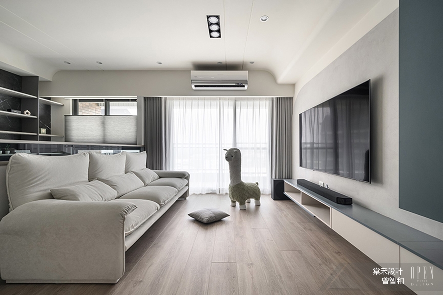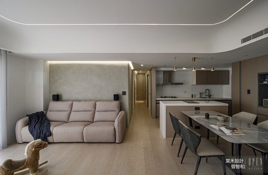 為了化解實用與健康間的矛盾,棠禾設計選擇折中方案。「在居者長時間休息的私領域,便使用比較健康的系統櫃。」總監娓娓道來,「在客廳或是書房等使用時間較短的區域,我們推薦木作櫃體。」這種靈活的設計手法,不僅在滿足客戶追求環保健康的同時,兼顧耐用性的需求,更拓寬設計團隊的創作疆界,可謂一舉多得。