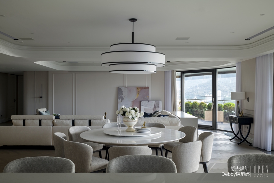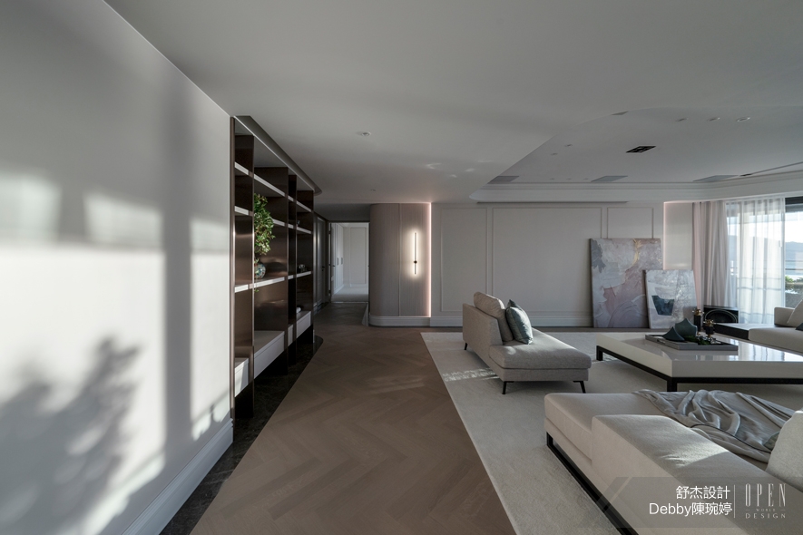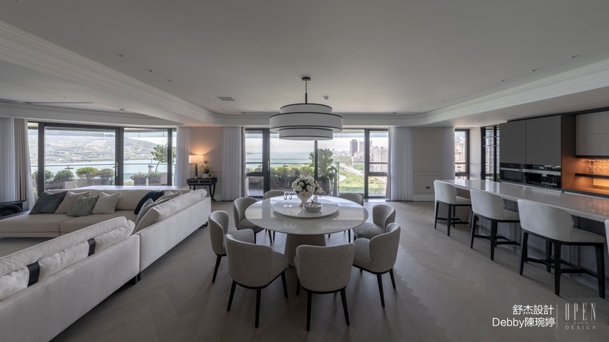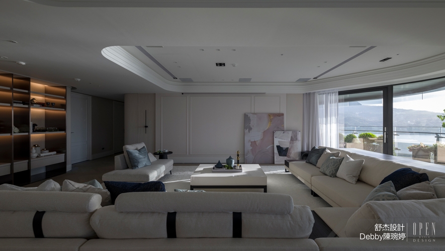 《大隱水岸》憑藉打造臨水岸百坪豪宅為概念主軸,大片落地窗引入充沛自然光、遼闊水景,再利用屋內白色主調反射光線,營造出明亮寬敞的空間感,佐搭延伸至窗邊的弧形天花板,呼應水岸靈動意象,室內戶外彼此相映成趣。團隊充分利用「陽光x水岸」四季更迭景致,以簡馭繁,以樸為美。線條與平面交織,形塑恬淡雅致的生活意境,使居所化身為一方清雅脫俗的桃源。