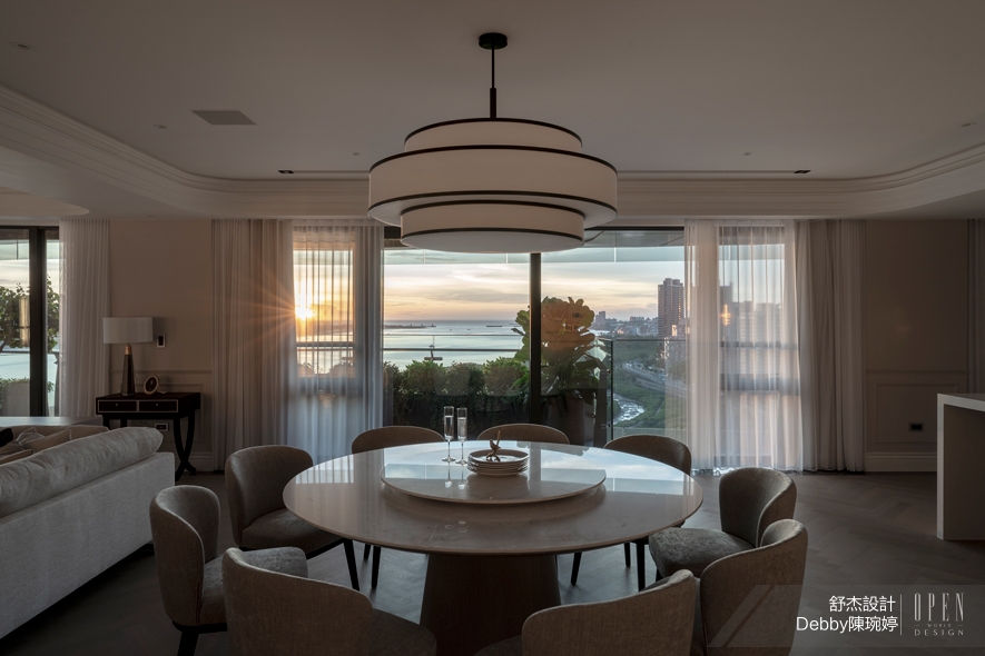 團隊以老子《道德經》「上善若水」作為設計理念,並契合屋主對大自然的嚮往,舒杰設計團隊以柔和流暢線條和輕淺溫柔色調為基,將水的柔和、流動特性融入空間,打造融合現代美式元素的低調奢華風。舒杰設計總監陳琬婷表示:「我們希望通過設計,讓居者在繁忙的都市生活中,能感受到水岸美景為內心所帶來的平靜。」
