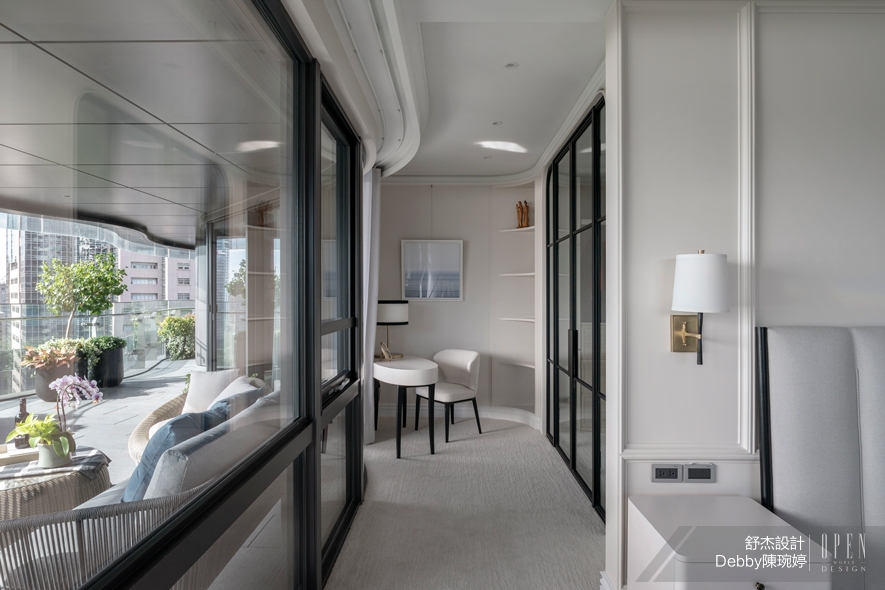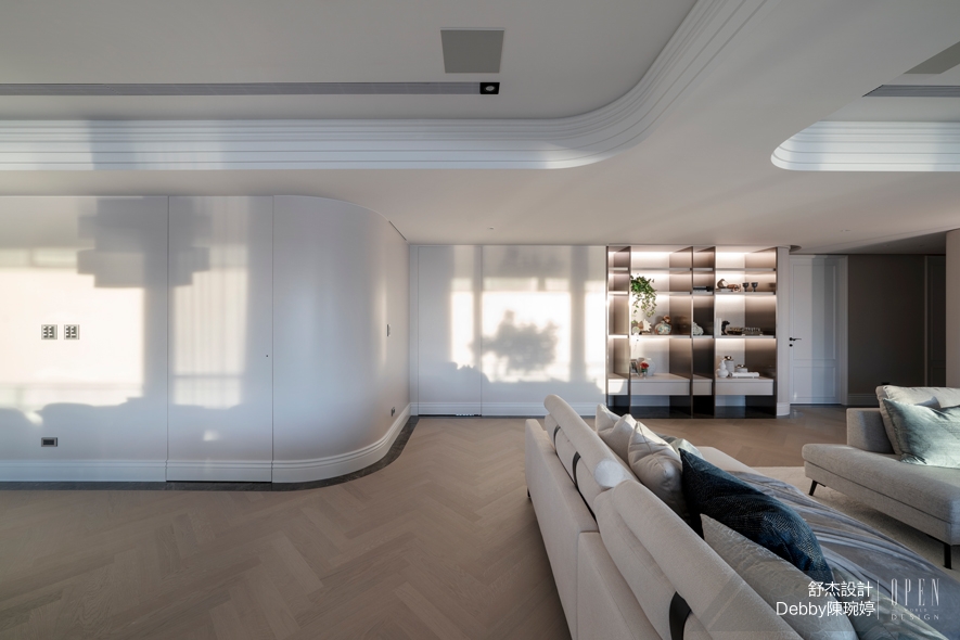 巧奪天工處當屬客廳一隅,為使室外丘壑自然之美與室內相映成趣,團隊摒除傳統電視機能,改以投影布幕規劃,使得主牆面如同一幅素淨宣紙,隨時準備接納山海畫卷,以此保持牆面的簡潔,維持開闊感,又提供完整視聽系統。通往主臥角落處,弧線如行雲流水,將櫃體隱於無形;細膩的溝縫線條渾然天成,漆料處理更是畫龍點睛,使之閉合時如一方素雅的屏風,開啟白與線的無聲對話,頗有「大音希聲」之境。