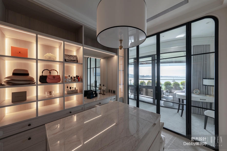 其次,材料的選擇和搭配也是本案的一大亮點。陳總監強調:「材料銜接是費工夫的地方,需要瞭解每種材質的特性才能排出合適的施作順序。」衣帽間櫃體運用鍍鈦金屬,透過間接照明更顯其細膩質感,將材質紋理的凹凸面逕自展現出豐富而意蘊深遠之趣。
